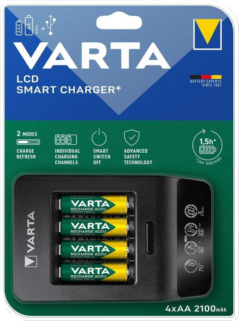 Зарядное устройство VARTA LCD Smart Charger+ — это интеллектуальное устройство для NiMH аккумуляторов типоразмеров AA и AAA, обеспечивающее сверхбыструю зарядку благодаря току до 1600 мА. Главная особенность модели — два режима работы: стандартная зарядка и режим восстановления (Refresh), позволяющий вернуть к жизни старые аккумуляторы с упавшей ёмкостью. В комплект входят четыре высокоемких NiMH аккумулятора AA 2100 мА·ч .